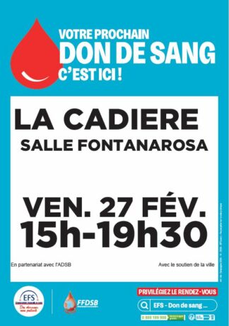 Le Vendredi 27 février de 15h à 19h30 à LA CADIERE, salle Fontanarosa
