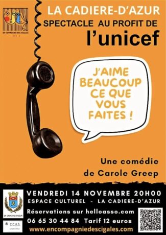 Le CCAS organise un spectacle au profit de l’UNICEF. Une comédie piquante de Carole Greep, Le Vendredi 14 Novembre à 20h00 à l’espace culturel de La Cadière d’azur.